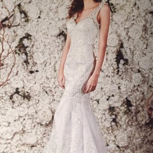 Slip style gown construction with distinct embroidered Venice lace patterns on a bold soft satin under layer. Zipper back.